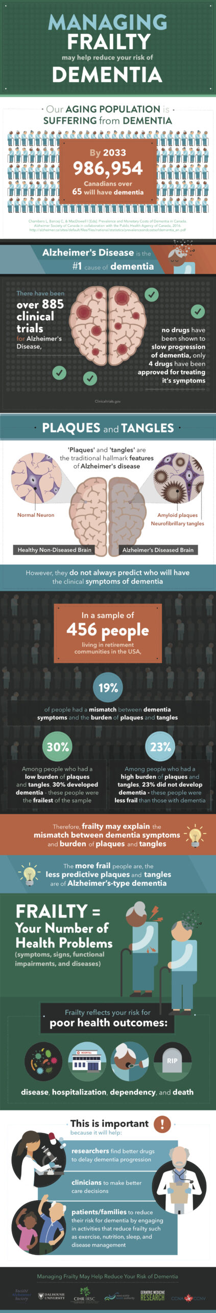 Understanding that frailty influences who develops dementia in spite of the presence of plaques and tangles may help us improve our treatment targets (i.e. create frailty-reduction programs) and improve prevention initiatives. For details, take a tour through our visual abstract below, “Managing frailty may reduce your risk of dementia”.